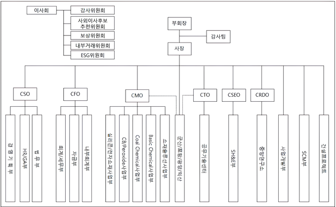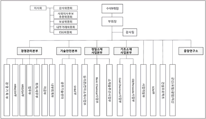 새 조직도에서는 해당 구조가 해체되고 각 사업부가 정밀소재사업본부와 기초소재사업본부로 나뉘는 이원화 체제가 도입됐다. 정밀소재사업본부에는 실리콘·전자소재사업부와 베이직케미칼사업부, 소재솔루션 사업부가 편재됐고 기초소재사업본부에는 Coal Chemical 사업부와 CB·Peroxide 사업부가 편재됐다.