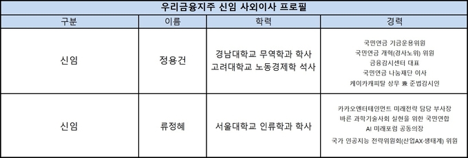우리금융은 정기주주총회에서 총 2명의 사외이사를 새롭게 선임하고, 1명의 사외이사를 재선임할 예정이다. 정기주주총회를 끝으로 퇴임하는 사외이사는 이은주 서울대학교 언론정보학과 교수와 박선영 동국대학교 경제학과 부교수다.