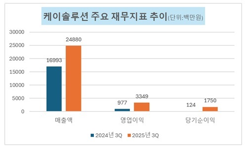 케이솔루션의 매출 규모는 최근 4년 사이 약 2.3배 확대됐다. 2021년 99억9428만원이었던 매출액은 2022년 150억338만원으로 증가했으며 2023년 229억2153만원, 2024년 228억5224만원을 기록했다. 지난해 3분기 누적 매출액은 248억7995만원으로 전년 동기(169억9276만원) 대비 46.4% 증가했다. 이는 전년도 연간 매출을 넘어선 수치다.