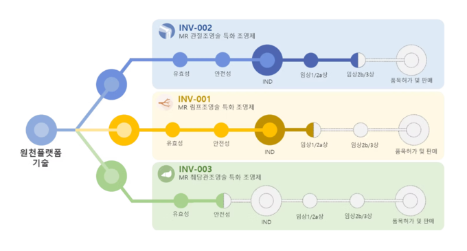 주요 파이프라인으로는 근골격계와 림프혈관계 조영제 등이 있다. 근골격계 후보물질인 INV-002는 2025년 6월 임상 3상에 진입했으며, 림프혈관계 후보물질 INV-001은 2026년 완료를 목표로 임상 1/2a상을 진행하고 있다. 2020년 시리즈A를 시작으로 2024년 10월 185억원 규모의 시리즈C까지 총 세 차례의 투자 유치를 마무리했다.