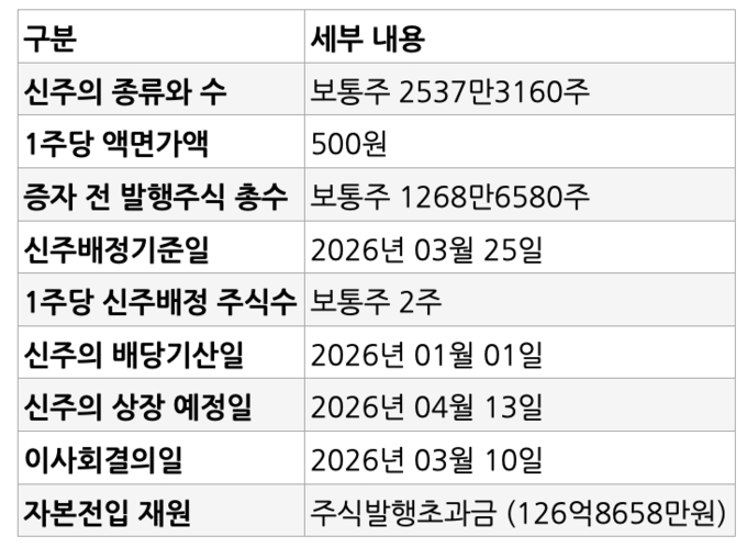 신주 배정 기준일은 3월 25일이며 신주 상장 예정일은 4월 13일이다. 이번 무상증자의 재원은 주식발행초과금 126억8658만원을 활용한다.