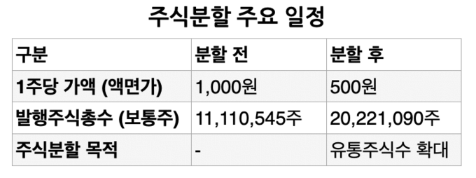 금융감독원 전자공시에 따르면 기존 1000원이었던 1주당 액면가액은 500원으로 분할된다. 이에 발행주식총수는 보통주 기준 기존 1111만545주에서 2022만1090주로 늘어난다. 주식 수가 약 2배로 늘어나면서 시장 내 주식 유통 물량이 풍부해질 전망이다.