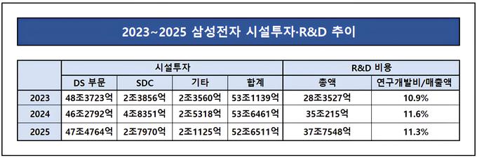 이외에도 지난해 삼성전자의 경우 연구개발(R&D) 투자도 확대됐다. 삼성전자 지난해 연구개발비는 37조7548억원으로 전년 35조215억원 대비 약 7.8% 증가했다. 연구개발비 비중은 매출 대비 11.3% 수준을 유지했다. 반도체 미세공정과 차세대 메모리 기술 경쟁력을 유지하기 위한 투자로 해석된다.