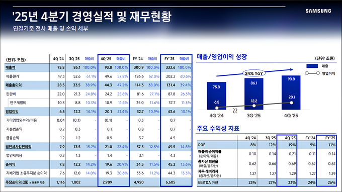 최근 공개된 삼성전자 사업보고서에 따르면 삼성전자는 지난해 연결 기준 매출 333조6059억원, 영업이익 43조6011억원을 기록했다. 지난해 AI 관련 수요로 이어진 반도체 업황 회복과 고부가 메모리 판매 증가 등이 맞물리며 역대 최대 매출을 달성했다.