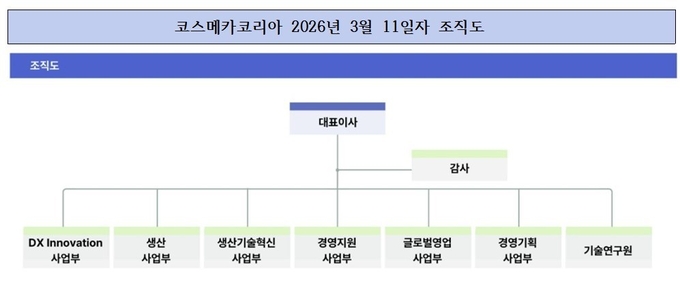 최근 코스메카코리아가 공시한 2026년 정기 주주총회 자료에 따르면 2026년 3월 11일 기준 조직도에서 대표이사 아래 ▲DX Innovation 사업부 ▲생산사업부 ▲생산기술혁신사업부 ▲경영지원사업부 ▲글로벌영업사업부 ▲경영기획사업부 ▲기술연구원 부서가 배치됐다.