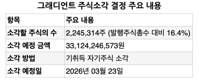 금융감독원 전자공시에 따르면 소각 대상 주식은 전체 발행주식 총수의 16.4%에 해당하는 물량이다. 1주당 가액은 2500원이며 소각 예정 금액은 평균 취득단가를 적용해 산출한 331억2424만6573원이다. 소각 예정일은 2026년 3월 23일이다.