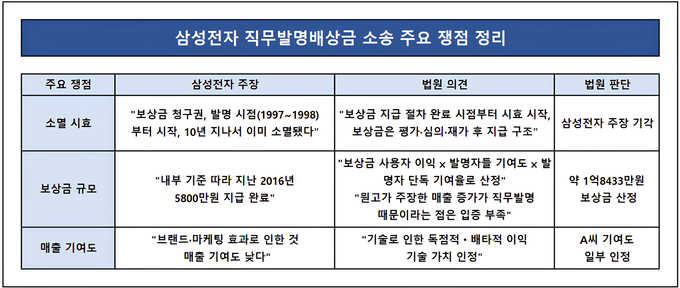 분쟁은 A씨 퇴사 17년 뒤 본격화됐다. A씨는 퇴사 17년이 지난 2015년 삼성전자에 직무발명 보상을 요구했고 삼성전자는 2016년 사내 직무발명 보상 기준에 따라 총 5800만원을 지급했다. 다만 A씨는 해당 기술이 제품 성능과 판매에 기여해 삼성전자가 이익을 얻었다며 보상액이 부족하다고 보고 약 3억원 규모 추가 보상을 요구하는 직무발명보상금 소송을 삼성전자에 제기했다.