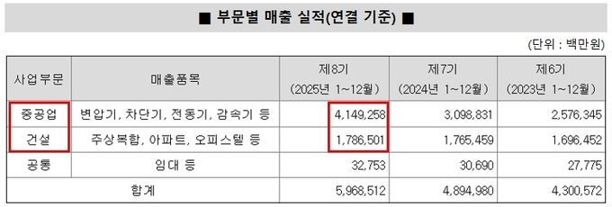 특히 전력·에너지 사업이 성장을 견인했다. 해당 부문 매출은 약 4조1492억원으로 전년 대비 30% 이상 증가하며 전체 매출의 약 70%를 차지했다. 전력망 투자 확대와 초고압 전력기기 수요 증가가 실적 상승을 이끈 것으로 분석된다.