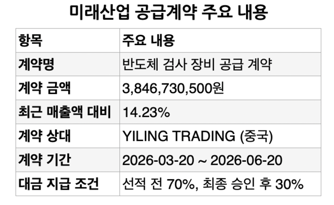 [FETV=심수진 기자] 미래산업은 20일 중국 YILING TRADING과 반도체 검사 장비 공급계약을 체결했다고 밝혔다.