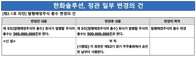 [FETV=손영은 기자] 한화솔루션이 발행예정주식 총수를 5억주로 확대하려는 움직임을 보였다. 미국 태양광 생산 단지 투자 부담과 재무구조 개선 필요성 등을 감안한 자금조달의 포석으로 풀이된다.