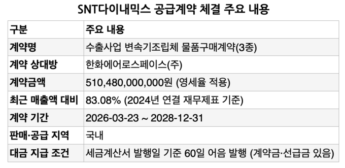 대금 지급은 세금계산서 발행일 기준 60일 이내에 어음을 발행하는 조건이며 계약금 및 선급금이 포함돼 있다. 계약 기간은 2026년 3월 23일부터 시작돼 2028년 12월 31일에 종료될 예정이다. SNT다이내믹스는 “방위산업의 보안 관계상 계약과 관련한 구체적인 세부 사항은 기재를 생략”했다고 설명했다. 계약의 금액 및 기간 등은 사업 진행 과정에 따라 향후 변동될 수 있다.