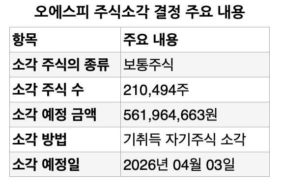 금융감독원 전자공시에 따르면 오에스피는 보통주 21만494주를 소각할 예정이다. 소각 예정 금액은 5억6196만원 규모다. 소각 예정일은 4월 3일이며 관계기관과의 협의 과정에서 변동될 수 있다.