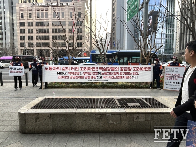이날 주총 현장에는 고려아연 노조가 피켓 시위를 진행하기도 했다. 고려아연 노조는 "MBK의 먹튀경영과 무책임 경영이 노동자와 함께할 자리는 없다"며 "고려아연 경영참여를 당장 중단하고 국가기간산업에서 철수하라"는 내용의 현수막을 내걸었다. 이들은 "약탈적·무책임 경영으로 홈플러스를 망친 MBK에게 국가기간산업을 맡기시겠습니까"라는 문구가 적힌 피켓을 들고 농성을 벌였다.