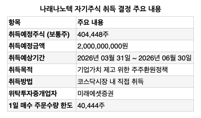 금융감독원 전자공시에 따르면 나래나노텍은 보통주식 40만4448주를 장내에서 직접 취득할 예정이다. 취득 예상 기간은 2026년 3월 31일부터 2026년 6월 30일까지이며 위탁투자중개업자는 미래에셋증권이 맡았다.