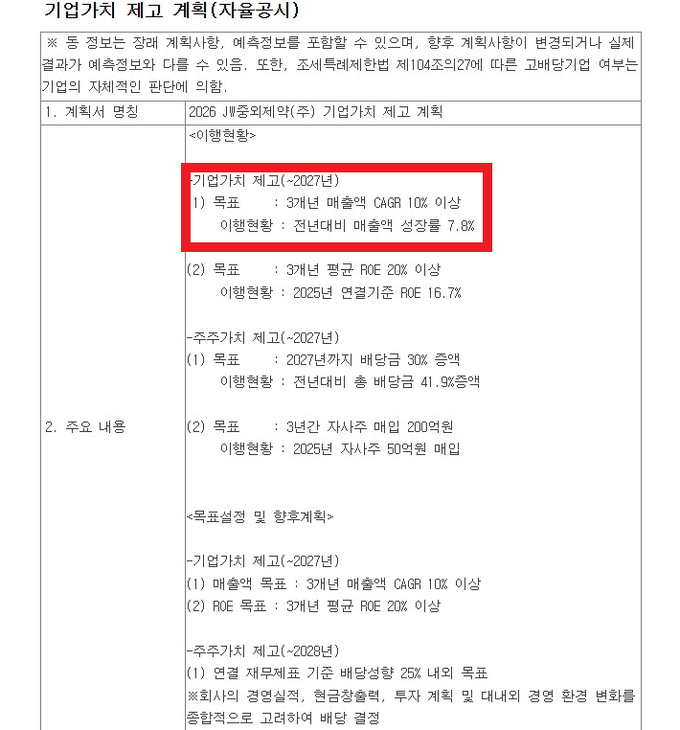JW중외제약 관계자는 “이번 공시는 지난해 수립한 기업가치 제고 계획의 1년차 이행 현황을 점검하는 차원”이라며 “3개년 목표는 단기간에 달성되는 구조가 아닌 만큼 기존에 제시한 연평균 10% 성장 목표를 유지하고 단계적으로 이행해 나갈 계획”이라고 말했다.