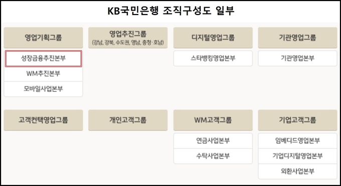 성장금융추진본부는 WM추진본부, 모바일사업본부와 함께 영업기획그룹 산하에 배치됐다. 신설 조직을 이끌어갈 인물에는 이종우 본부장이 승진 인사를 통해 선임됐다. 이 본부장은 성장금융추진본부장으로 이동하기 전에는 기업상품부장을 맡았다.