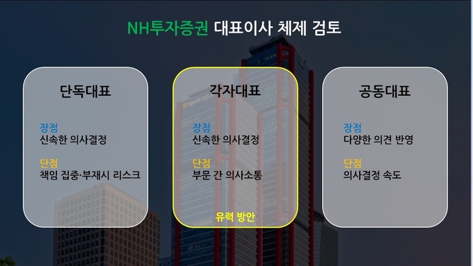 NH투자증권 관계자는 “아직 확정된 내용은 없다”며 “대표 체제별 장단점을 검토한 뒤 임시 주주총회를 통해 결정할 계획”이라고 말했다.