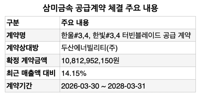 금융감독원 전자공시에 따르면 확정 계약금액은 108억1295만2150원이다. 삼미금속의 최근 매출액(764억4134만4507원) 대비 14.15%에 해당하는 규모다. 계약 기간은 2026년 3월 30일부터 2028년 3월 31일까지다.