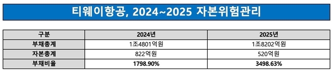 티웨이항공 관계자는 "항공산업에서는 항공기 리스료 전체를 부채로 인식해야 하는 특성상 다른 산업보다 부채가 크게 인식된다"고 설명했다. 이어 "사업 특성상 투자와 운용 구조에 따라 부채비율이 변동될 수 있다"며 "향후 재무 건전성 유지와 리스크 관리를 최우선으로 운영해 나갈 계획"이라고 덧붙였다.