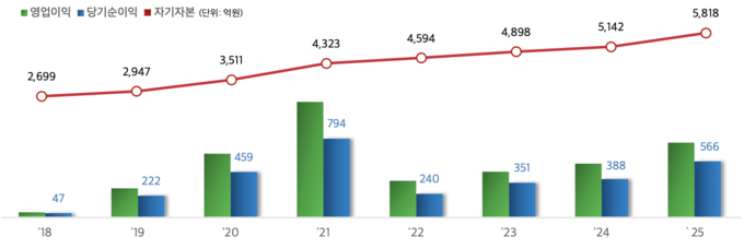 수익성 지표인 당기순이익 역시 업황 변동 속에서도 견조한 흐름을 유지하고 있다. 2021년 794억원으로 정점을 찍은 뒤 시장 환경이 악화된 2022년 240억원의 실적을 기록했으나 2023년 351억원, 2024년 388억원으로 꾸준히 반등했다. 지난해에는 전년 대비 46% 증가한 566억원을 달성했다. 이는 철저한 리스크 관리와 안정적인 사업 운영을 통해 실적 유지를 지속한 결과로 분석된다.