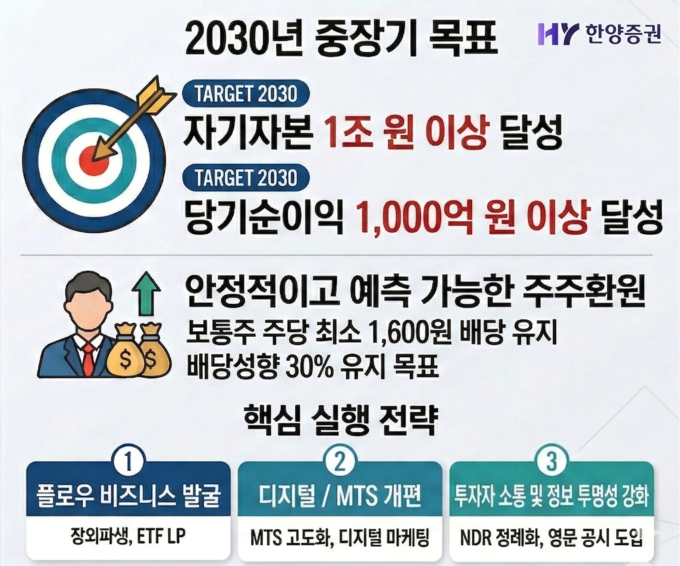 한양증권은 지난달 26일 기업가치 제고 계획을 통해 2030년까지의 중장기 로드맵을 제시했다. 이번 계획은 손익과 조직 규모, 주요 재무지표(PER·PBR·ROE·ROA 등) 및 배당 정책에 대한 현황 진단을 바탕으로 수립됐다. 한양증권은 업종 평균 대비 높은 자산 및 자본효율성을 바탕으로 이익의 질을 높여 저평가된 밸류에이션 회복과 주주가치 극대화를 실현한다는 방침이다.