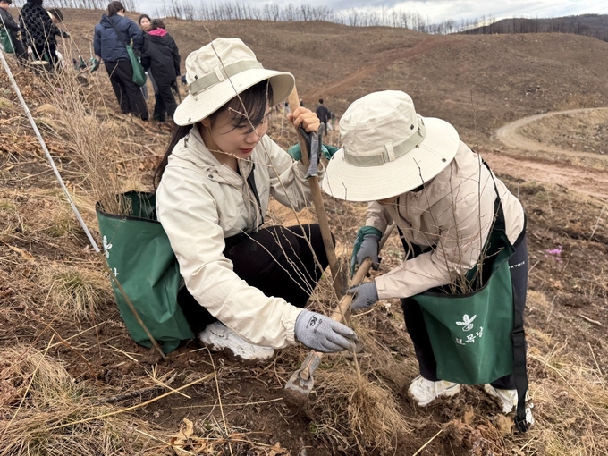[FETV=신동현 기자] SK텔레콤은 유한킴벌리와 함께 지난 4일 경북 안동시 풍천면 일대에서 산불 피해지역 복원을 위한 나무심기 활동을 진행했다. 이날 행사에는 양사 임직원과 가족 100여명이 참여해 헛개나무, 미선나무, 노랑무늬붓꽃 등 1500그루를 심었다. 이번 활동은 양사가 지난해 9월 체결한 ESG 협약의 일환으로 마련됐으며, 양사는 2030년까지 5년간 총 1만그루를 식재하고 AI 기술을 활용한 산림 복원에도 나설 계획이다. 사진은 SK텔레콤과 유한킴벌리 임직원 및 가족들이 안동 산불 피해지역에서 나무심기 봉사활동을 하는 모습. [사진 SK텔레콤]