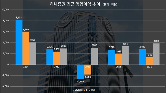 이처럼 IB와 WM 부문 집중 전략을 내세운 배경에는 최근 실적 흐름도 맞물려 있다. 하나증권의 영업이익은 2021년 8131억원에서 2022년 2776억원으로 줄었고, 2023년에는 2645억원의 영업손실을 기록했다. 이후 2024년 2710억원, 2025년 2810억원으로 회복세에 들어섰지만 2021년과 비교하면 여전히 65.4% 낮은 수준이다.