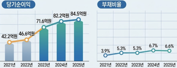 수익성 지표도 성장세를 나타냈다. 당기순이익은 2021년 42억2163만원에서 2022년 46억6281만원, 2023년 71억5827만원으로 증가했다. 2024년 82억1751만원에 이어 지난해 84억5246만원을 기록하며 5년 연속 우상향했다.