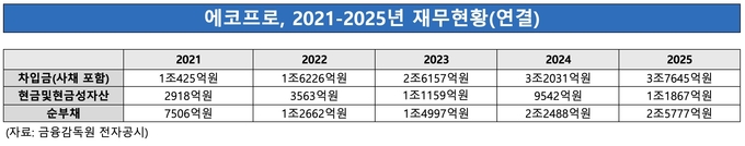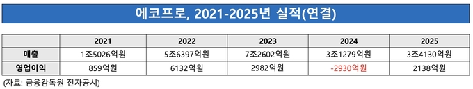 에코프로는 그룹 전반실적이 저하된 상황이다. 전기차 캐즘과 과잉생산능력에 따른 가격 경쟁 심화, 고정비 부담 증가에 따른 영향이다. 에코프로의 매출비중 75.2%를 차지하는 주력 자회사 에코프로비엠이 전기차 사업 둔화에 영향을 받아 급락하며 그룹 실적이 동반 하락했다. 최근 5년간 에코프로 연결기준 매출은 2021년 1조5026억원, 2022년 5조6397억원, 2023년 7조2602억원, 2024년 3조1279억원, 2025년 3조4130억원이다.