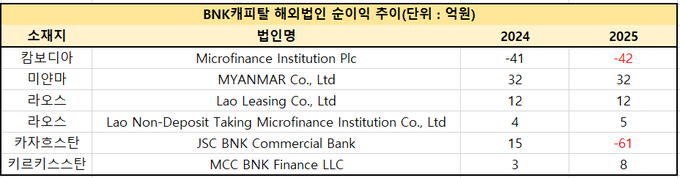 지난해 말 BNK캐피탈 해외법인은 순손실 44억원을 기록했다. 미얀마(32억원)·라오스(17억원)·키르기스스탄(8억원)은 순이익을 냈지만 카자흐스탄(-61억원)과 캄보디아(-42억원)가 적자를 기록했다.