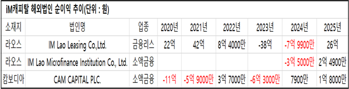 해외사업 확장과 함께 실적도 성장 흐름을 이어갔다. 2020년부터 2022년까지는 수십억원의 흑자를 냈지만 2023년 –44억원, 2024년 –10억원으로 순손실이 발생했다. 실적 변동은 라오스 법인 iM Lao Leasing Co(iLLC) 영향이 컸다. 해당 법인은 초기에는 흑자 확대를 이끌었지만 환율 변동에 따른 환차손과 현지 경기 둔화 영향이 맞물리며 손실이 확대됐다.