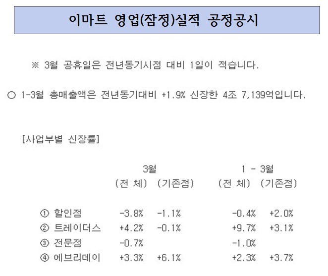 이마트 관계자는 “대형마트는 주말과 공휴일 매출 비중이 높은 구조로 공휴일 하루 차이도 실적에 영향을 준다”며 “이번 3월은 전년 대비 공휴일이 하루 적었던 점이 반영됐다”고 말했다.