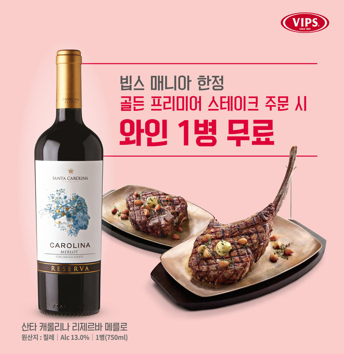 2월에 출시한 ‘골든 프리미어 스테이크’인 ‘토마호크’ 또는 ‘포터하우스’를 ‘빕스 매니아’가 주문하면, 스테이크와 최상의 페어링을 이루는 ‘산타 캐롤리나 리제르바 메를로’ 레드 와인 1병(750ml)을 3월 내내 공짜로 제공한다. CJ ONE 앱 ‘마이 쿠폰’ 코너에 자동 지급된 ‘매니아 쿠폰’을 제시하면 테이블당 1매 사용 할 수 있으며, 타 쿠폰 및 행사·제휴 할인 카드도 중복 가능하다.