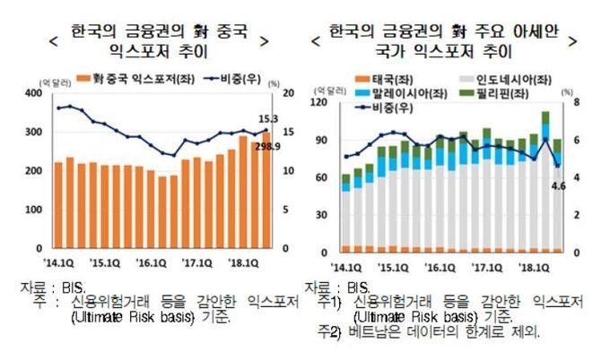 한국 금융권의 중국에 대한 익스포저(위험노출액) 규모가 2016년 2분기 186.1억 달러에서 2018년 3분기 298.9억 달러로 증가했고, 같은 기간 한국의 익스포저 총액 대비 대(對) 중국 익스포저의 비중이 12.3%에서 15.3%로 늘어났다.