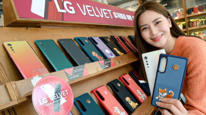 LG전자가 스마트폰 액세서리 전문업체 디자인스킨과 손잡고 내놓은 LG 벨벳 전용 케이스를 소개하고 있다.