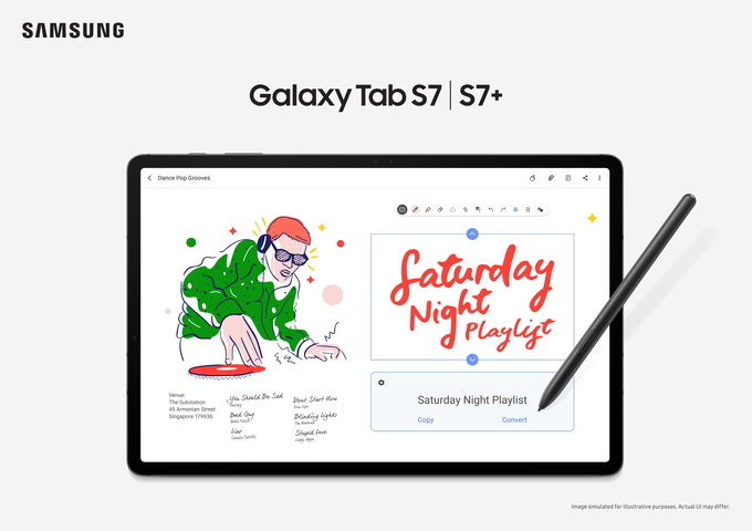 또 '삼성 노트'는 필기와 동시에 음성을 녹음하고 이후 해당 부분 필기를 선택하면 녹음된 음성을 재생할 수 있는 기능을 새롭게 제공한다. 특히, '갤럭시 탭 S7·S7+'는 'S펜'을 활용해 사용자의 창의적인 활동을 지원하는 다양한 앱을 지원한다. 일러스트, 웹툰, 만화, 애니메이션 제작툴 '클립 스튜디오 페인트(Clip Studio Paint)'를 안드로이드 최초로 지원하며 안드로이드 No.1 필기앱 '노트쉘프(Noteshelf)', 8000개 이상의 템플릿을 무료로 제공하는 그래픽 디자인 제작 플랫폼 '캔바(Canva)'를 선탑재했다.