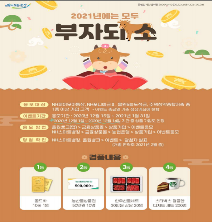 [FETV=유길연 기자] NH농협은행은 신축년 새해를 맞이하여 이달 31일까지 디지털 금융상품 가입고객을 대상으로 ‘2021년에는 모두 부자되소’ 이벤트를 진행한다.