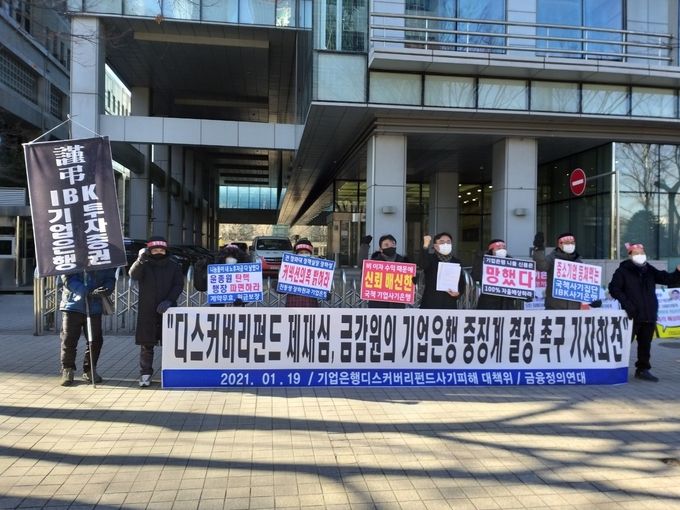 기업은행 디스커버리 펀드 사기피해 대책위원회(대책위)는 19일 서울 여의도 금감원 본원 앞에서 ‘디스커버리펀드 제재심의위원회 기업은행 중징계 결정 촉구 기자회견’을 열었다. 대책위는 “‘금융기관검사 및 제재에 관한 규정’에 따르면 금감원은 기업은행을 검사해야 하고 건전한 영업 또는 업무를 크게 저해하거나 건전영업을 훼손한 금융기관을 제재해야 한다”며 “이에 금감원은 전 · 현직 기업은행장과 직원들의 금융질서 문란행위와 금융소비자 권익을 크게 훼손한 행위에 대해 중징계를 결정해야 마땅하다”고 주장했다.