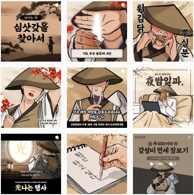 신세계면세점은 공식 인스타그램의 화자를 ‘조선에서 온 SNS 담당자 심삿갖’이라는 가상 캐릭터로 설정해 쌍방향 소통 구조를 만들었다. 조선시대 어투와 동양체 일러스트레이션 등을 통해 신세계면세점만의 개성 및 특색을 갖춘 인스타그램 계정으로 탈바꿈했다.