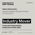 [FETV=신동현 기자] 카카오게임즈는 S&P Global이 발표한 2025년 기업 지속가능성 평가 CSA(Corporate Sustainability Assessment)에서 ‘인더스트리 무버(Industry Mover)’로 선정됐다고 26일 밝혔다. CSA는 환경(E)·사회(S)·지배구조(G)를 종합 평가하는 글로벌 ESG 지표다. 산업군별로 전년 대비 점수 상승 폭이 가장 큰 기업에 ‘인더스트리 무버’ 등급을 부여한다. 올해는 약 9200개 참여 기업 중 49개 기업이 해당 등급을 받았다. 카카오게임즈는 전년 대비 32% 높은 점수를 기록하며 인터랙티브 미디어·서비스&홈 엔터테인먼트(IMS) 산업군에서 선정됐다. 카카오게임즈는 산업군 상위 15% 이내이면서 최고 점수 대비 30% 이내 기업에 주어지는 ‘지속가능성 연례보고서 멤버’에도 이름을 올렸다. 올해 평가에서 국내 게임사 중 해당 등급을 받은 기업은 카카오게임즈가 유일하다. 카카오게임즈 관계자는 “이번 ‘인더스트리 무버’와 ‘지속가능성 연례보고서 멤버’ 선정을 통해 글로벌 시장에서 카카오게임즈의 ESG경영 역량을 인정받았다”며 “앞으로도 다방면에서 ESG경영을 실천해 글로벌 수준의 E