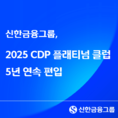 [FETV=권현원 기자] 신한금융그룹이 CDP(탄소정보공개프로젝트)에서 5년 연속 플래티넘 클럽에 등재되며 기후변화 대응 부문에서 성과를 거뒀다. 10일 신한금융은 CDP 한국위원회가 발표하는 ‘2025 CDP Korea Awards’ 기후변화 대응 부문에서 최고 등급인 ‘Leadership A’를 받으며 8년 연속 명예의 전당, 5년 연속 플래티넘 클럽에 등재됐다고 밝혔다. 신한금융은 ‘Leadership A’등급을 받으며 5년 연속 플래티넘 클럽에 선정된 국내 유일 금융기관이다. 이번 성과는 기후변화 대응과 탄소감축 경영을 위한 신한금융의 일관된 노력이 글로벌 스탠다드 수준임을 재차 인정받았다는 점에서 의미가 깊다는 설명이다. CDP는 전 세계 주요 기업을 대상으로 기후 변화 대응과 관련된 정보 공개를 요청하고 이를 토대로 매년 보고서를 발간하는 프로젝트로 글로벌 환경 부문에서 가장 권위 있는 지표다. 신한금융은 국내 금융기관 최초로 자산 포트폴리오의 친환경 전환을 위한 ▲‘그룹 전환금융 가이드라인’ 제정 및 실행 ▲그룹 임직원들의 업무 중 탄소배출량을 측정 및 관리하는 ‘그린 인덱스 제도’ 확산 ▲재생에너지 사용 확대 등 그룹의 기후 전환 전략을 기반으