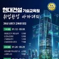 [FETV=박원일 기자] 현대건설 기술교육원이 미래 건설 산업을 이끌어갈 혁신 인재를 육성하기 위해 ‘2026년 상반기 취업완성 아카데미’ 기술교육생 모집을 실시한다고 16일 밝혔다. 이번 상반기 모집은 최근 건설 현장 트렌드와 산업 수요를 반영한 실무 중심 교육 과정으로 구성됐으며 총 10개 직무를 대상으로 진행된다. ▲플랜트전기·계장실무 ▲안전보건관리 ▲건설품질관리 ▲건설공정공사관리 등 4개 과정은 3월에 개강하고 ▲공조냉동기계산업기사 ▲스마트시티 등 2개 과정은 4월에 개강할 예정이다. ▲전기설비시공실무 ▲BIM건설관리 ▲스마트플랜트 ▲스마트안전 등 4개 과정은 3월부터 순차적으로 모집을 진행해 6월부터 교육을 시작한다. 모든 교육 과정은 고용노동부와 현대건설이 함께하는 국비지원 취업 교육과정으로 교육비, 실습재료비, 교재 등을 지원받을 수 있으며 일정 금액의 자비 부담(국민내일배움카드 운영규정에 의거)이 발생한다. 지원 대상은 국민내일배움카드 사용이 가능한 자이며 전형을 통해 선발된 교육생에게는 소정의 훈련장려금 혜택도 주어진다. 교육 수료자는 현대건설을 비롯해 동종 건설사 및 협력사로의 취업 연계를 적극 지원받을 수 있다. 주요 근무지로 디에이치 클