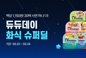 [FETV=이건우 기자] 반려견을 위한 프리미엄 자연화식 브랜드 ‘듀먼(D’human)’은 2월을 맞아 브랜드데이 행사 ‘듀듀데이’를 오는 22일부터 24일까지 3일간 진행한다고 20일 밝혔다. ‘듀듀데이’는 달마다 진행하는 듀먼의 브랜드데이 프로모션으로, 이번 행사는 자사 베스트셀러인 프리미엄 자연화식을 포함해 다양한 제품을 최대 74% 할인된 가격으로 만나볼 수 있는 기회다. 듀먼의 대표제품인 ‘자연화식’은 신선한 육류에 5가지 이상의 채소를 더해 높은 기호성은 물론, 균형 잡힌 영양 설계를 갖춘 강아지 화식이다. 사람도 먹을 수 있는 휴먼그레이드 등급의 원료를 100% 사용하고, 산화방지제, 착색료, 발색제, 겔화제 등 4가지 주요 합성 첨가물을 배제해 더욱 안심하고 급여할 수 있다. 다양한 단백질원에 채소를 더한 오리지널 6종과 닭가슴살과 함께 기능성 원료를 담은 기능성 라인 4종으로, 총 10종 라인업을 갖춰 반려견의 기호 및 건강 상태에 따라 맞춤 선택이 가능하다. 이번 프로모션에서는 자연화식 100g 제품 30팩을 팩당 1,150원의 할인가로 선보인다. 행사 기간에는 오후 6시부터 9시까지 단 3시간 동안 듀먼의 다양한 인기 간식을 만나볼 수 있