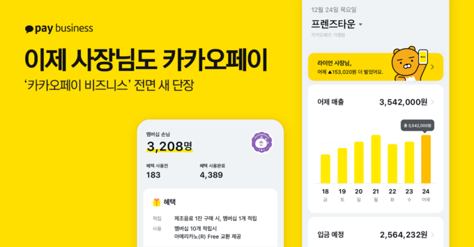 카카오페이는 간편결제 서비스 최초로 모바일 기반의 매장용 비즈니스 앱을 서비스해왔다. 이번에 업그레이드된 비즈니스 앱은 ▲매출 관리 ▲매장 관리 ▲멤버십 ▲매출 리포트 ▲결제 취소 ▲직원 관리 등 매장 관리 전반에 필요한 다채로운 기능을 무료로 제공한다. 카카오페이 가맹점 여부와 상관없이 모든 소상공인들이 활용할 수 있으며, 추후 온·오프라인 모든 결제 가맹점이 이용할 수 있도록 서비스를 확대할 계획이다.