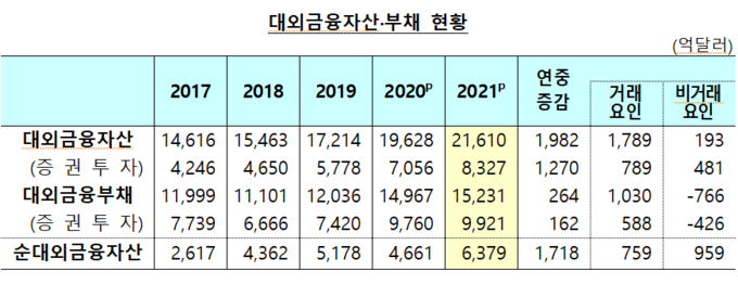 대외금융부채(외국인의 국내투자)는 작년 말 1조5231억달러로, 1년 새 264억달러 증가했다. 한편, 이중 비거주자의 지분증권 투자는 395억달러 감소한 것으로 나타났다. 대외금융자산의 증가 폭이 대외금융부채 증가 폭을 크게 넘어서면서 한국의 대외 지급 능력을 가늠할 수 있는 순대외금융자산(대외금융자산-대외금융부채)는 증가했다. 작년 말 기준 6379억달러를 기록한 것이다. 전년(4661억달러) 대비 1718억달러 많다.