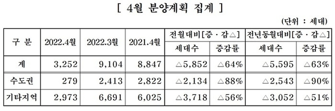 [FETV=김진태 기자] 대한주택건설협회(회장 박재홍)는 회원사를 대상으로 4월 주택분양계획을 집계한 결과, 18개사가 18개 사업장에서 총 3252가구를 공급한다고 29일 밝혔다. 이는 지난해 같은 달(8847가구) 대비 5595가구(63%) 감소한 수치다.