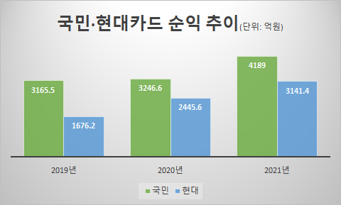2020년 현대카드와 국민카드의 순익 차이는 801억원으로 1년 전(1489.3억원)에 비해 크게 줄어들었다. 하지만 지난해 다시 250억원 가량 차이가 더 벌어지며 국민카드와의 간격을 더 이상 좁히지 못했다. 2021년 말 기준 현대카드와 국민카드(4189억원)의 순익 차이는 1047.6억원이다. 2년 만에 다시 국민카드와 1000억원 이상 순익 격차가 발생한 것이다.