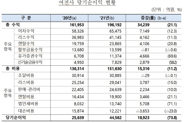 4일 금융감독원이 발표한 '2021년 여신전문금융회사 영업실적'에 따르면 지난해 말 기준 할부금융사 23개, 리스사 26개, 신기술금융회사 74개 등 123개 여전사의 당기순익은 4조4562억원으로 전년 동기(2조5639억원) 대비 1조8923억원(73.8%) 증가했다. 대출 확대로 이자수익이 12.3%(7149억원) 늘어난 6조5475억원, 리스와 렌탈 이익이 각각 11.3%, 20.8% 늘어난 4조1145억원, 2조3865억원을 기록했다. 유가증권 수익은 1조1374억원으로 69.4%나 늘었고, 신기술금융 수익도 7829억원으로 58.2% 증가했다. 반면 할부금융 수익은 1조3599억원으로 0.6% 감소했다.