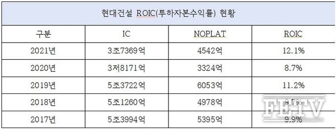 [FETV=김진태 기자] 현대건설이 곳간을 가득 채우고 있다. 코로나19 여파와 원자재 값 급등, 중대재해처벌법 시행에 따른 안전비용 증가 등 어려워지는 경영 여건으로 보릿고개가 올 수 있다는 우려에서다. 이에 현대건설은 자본유보율을 지속적으로 끌어올리며 불확실한 경영 환경에 대비하는 모양새다. 2020년 하락했던 투하자본수익률도 지난해 반등에 성공하면서 수익성을 견인했다.