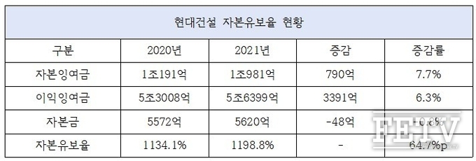 이익잉여금과 자본잉여금은 오르고 자본금은 줄면서 현대건설의 2021년 자본유보율(1198.8%)은 5년내 최고치를 갱신했다. 이는 전년(1134.1%)보다 64.7%포인트(p) 증가한 것으로 현대건설의 자본유보율은 2017년 이후 매년 쌓이는 추세다. 최근 5년간 현대건설의 자본유보율은 2017년(1048.9%), 2018년(1074.8%), 2019년(1138.5%)을 보였다.